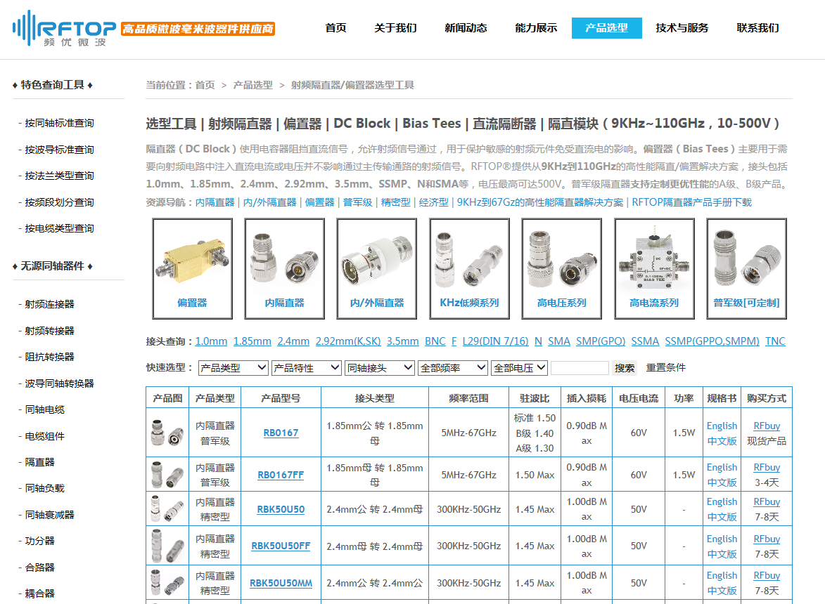 如需了解更多信息,敬请访问RFTOP隔直/偏置器选型工具:https://product.rftop.com/DCBlock.html
