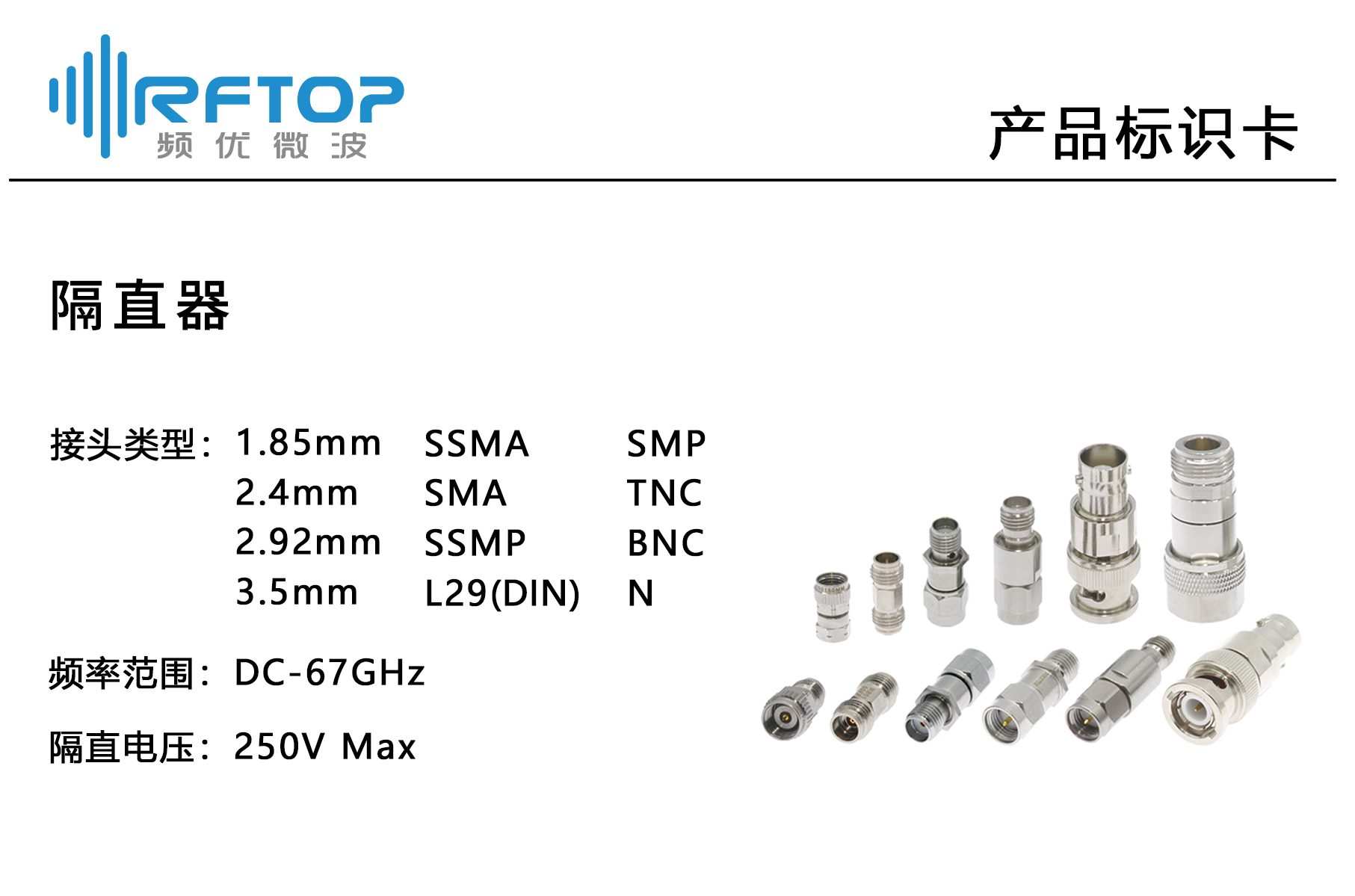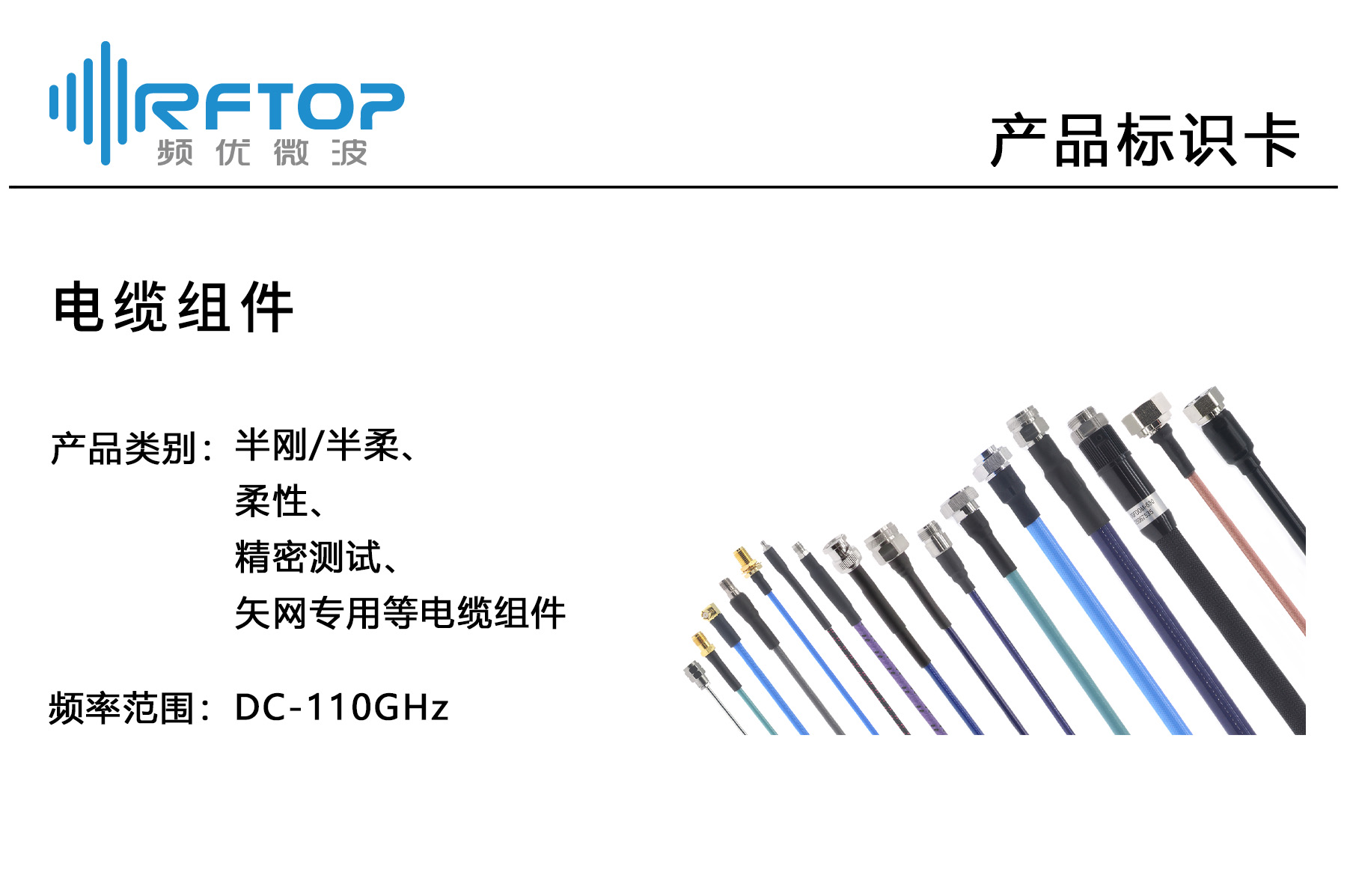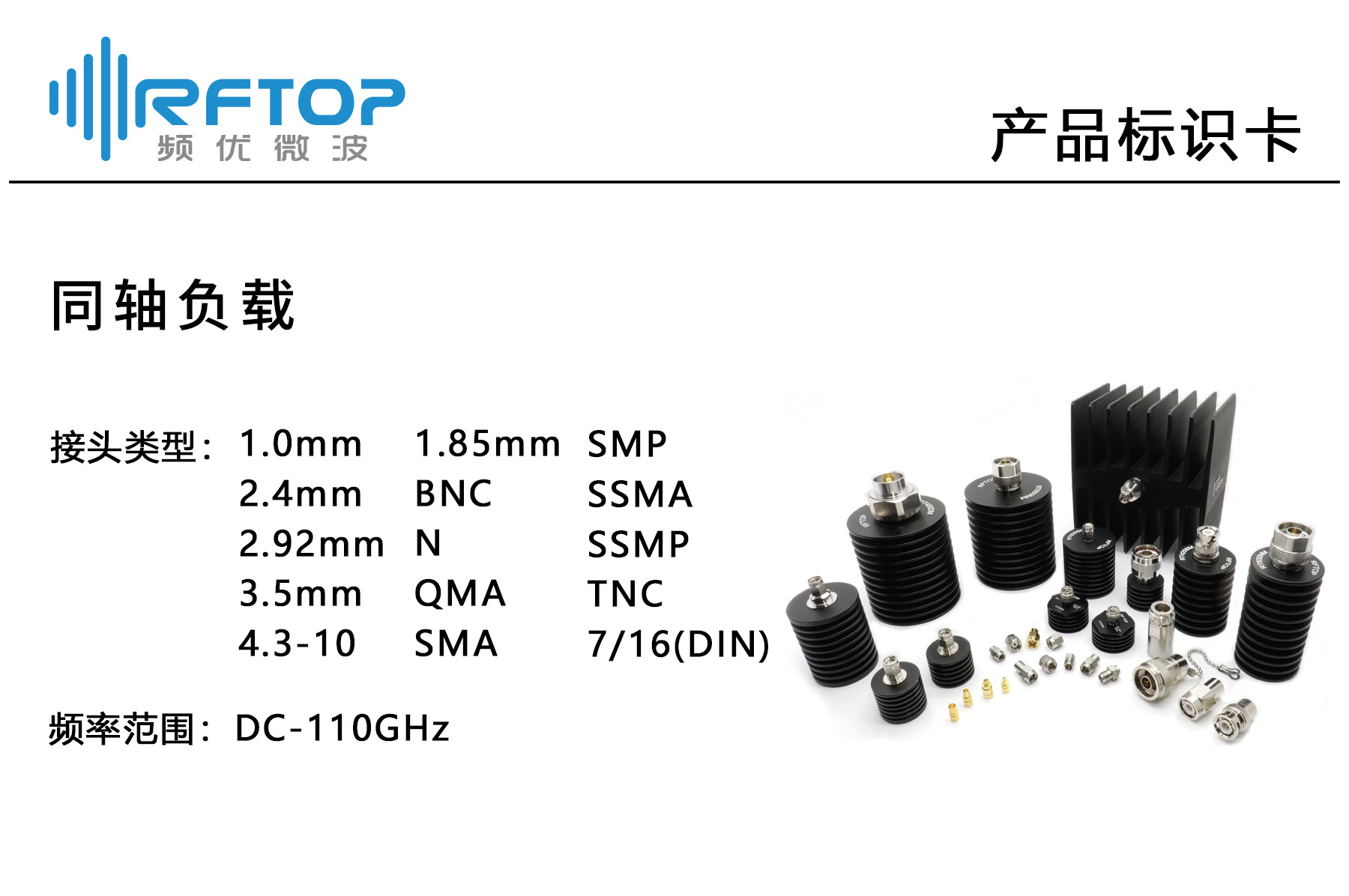 RFTOP®(频优微波)是一家专注研发、销售高品质微波毫米波器件的供应商,主要产品包括射频连接器、射频转接器、衰减器、负载、功分器、耦合器、射频放大器、同轴电缆、电缆组件、喇叭天线、波导同轴转换器和连接波导等,已形成覆盖DC-750GHz频段的系列,广泛应用于半导体、无线通信、航空航天、测试测量、科研院校等领域。