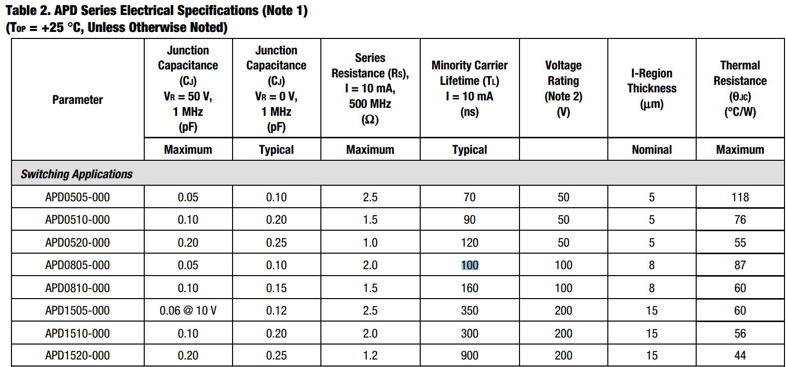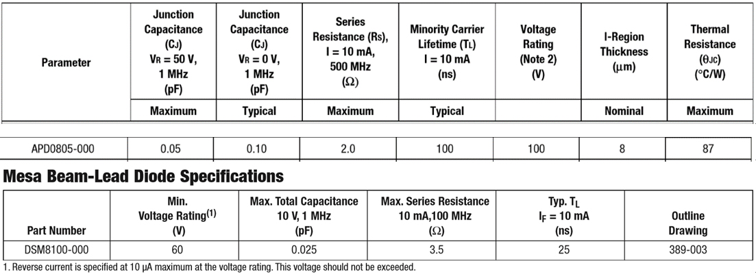实例选用skyworks的梁氏引线管DSM8100-000作为串联管,APD0805-000作为并联管进行一个简单的SP3T开关设计,两个管子的详细参数如图 7所示。