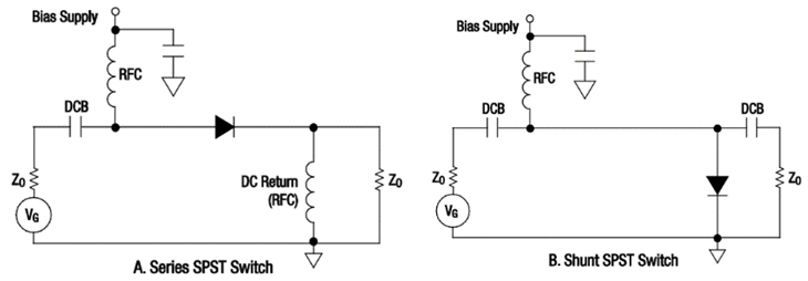 ·正向偏置时PIN管近似短路,串联使用时开关直通,并联使用时微波信号流向大地开关关断;反向偏置时PIN管对微波信号近似开路,串联使用时微波信号不能传输实现关断,并联使用时微波信号流向负载实现直通;