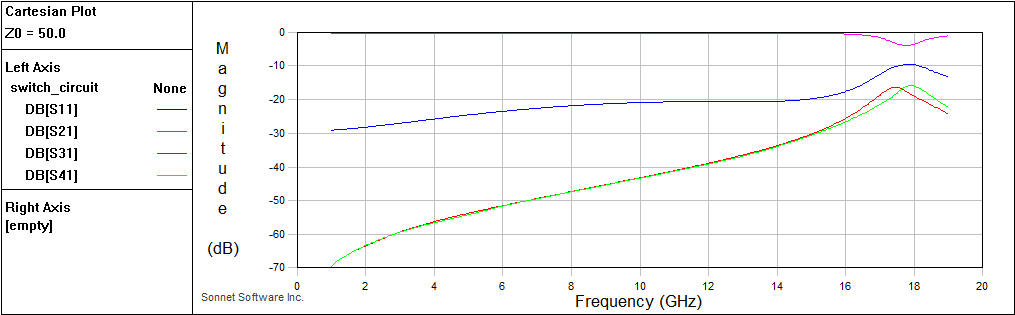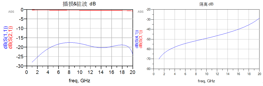 这里的电磁仿真结构中没有考虑扼流线圈的影响,因此在低频段开关也能工作的很好,但由于扼流线圈的存在,实际的开关不可能工作在这么理想的带宽里。扼流线圈小,低频段工作就要受影响。扼流线圈大由于自身的寄生电容效应高频处就无法达到理想状态,因此在实际设计中扼流线圈的设计也非常重要。