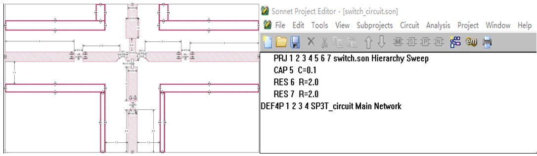 根据原理仿真的拓扑结构在电磁仿真软件中建立模型对开关进行电磁仿真,个人习惯对平面电路在sonnet中进行电磁仿真验证,仿真结构见图 10所示(图中对bonding线进行了近似模拟),由于电磁仿真结构中无法添加直接到地的元件,因此必须另外建立一个网表仿真文件将并联管的等效特性加入到电路中。