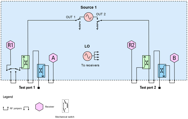 当矢网Source1-OUT2输出信号经过reference接收机R2输出到DUT port2,接收机B接收DUT port2反射回来的功率,测量比值被称为回波损耗,S11=20log(b/r2),单位dB。